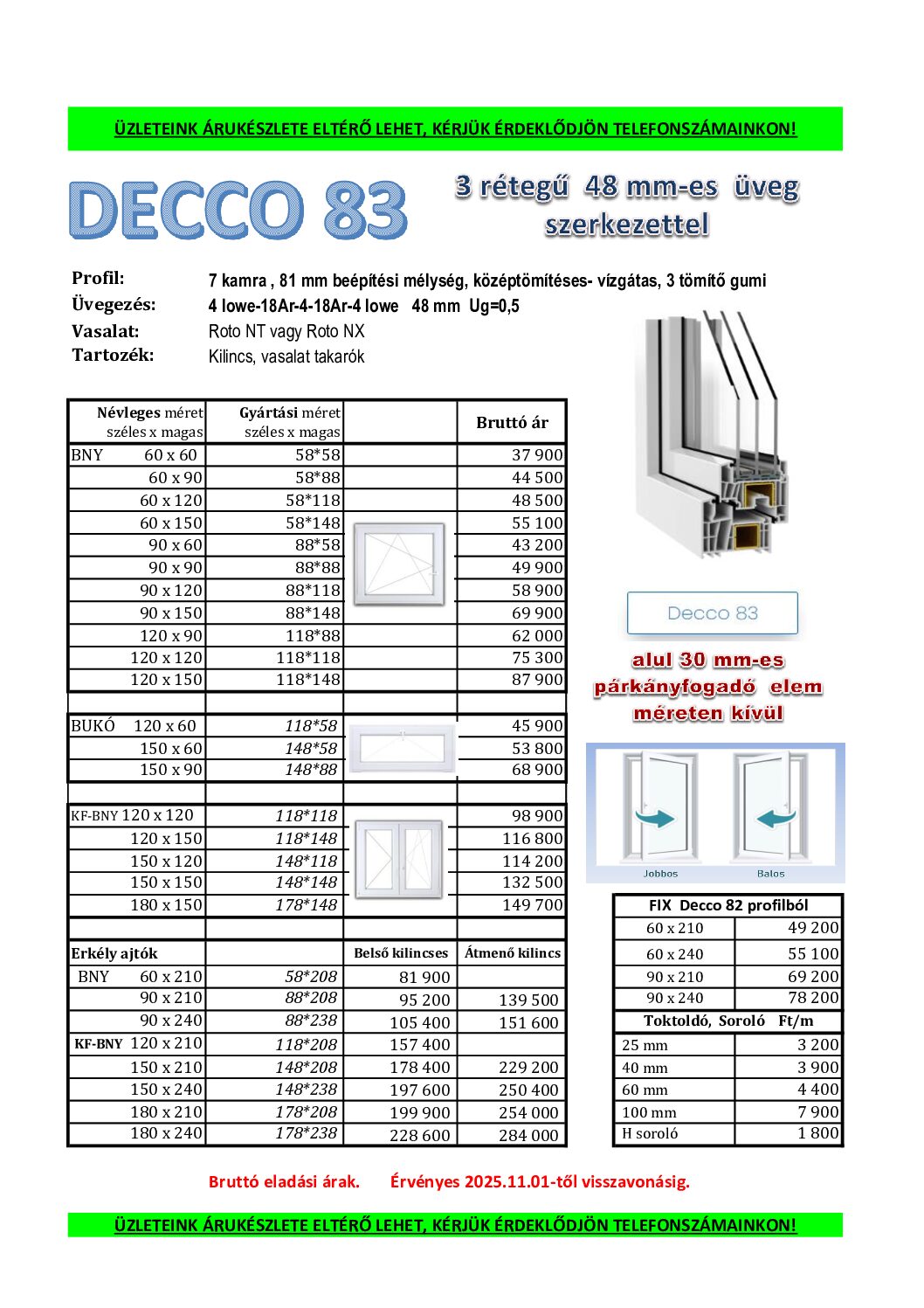 A Decco 83 egy magas minőségű, 81 mm-es beépítési mélységű műanyag ablakprofil, amely egyesíti az energiahatékonyságot, tartósságot és megfizethetőséget — ideális választás, ha kiváló ár/érték arányt keresel új otthonodba vagy felújításhoz.