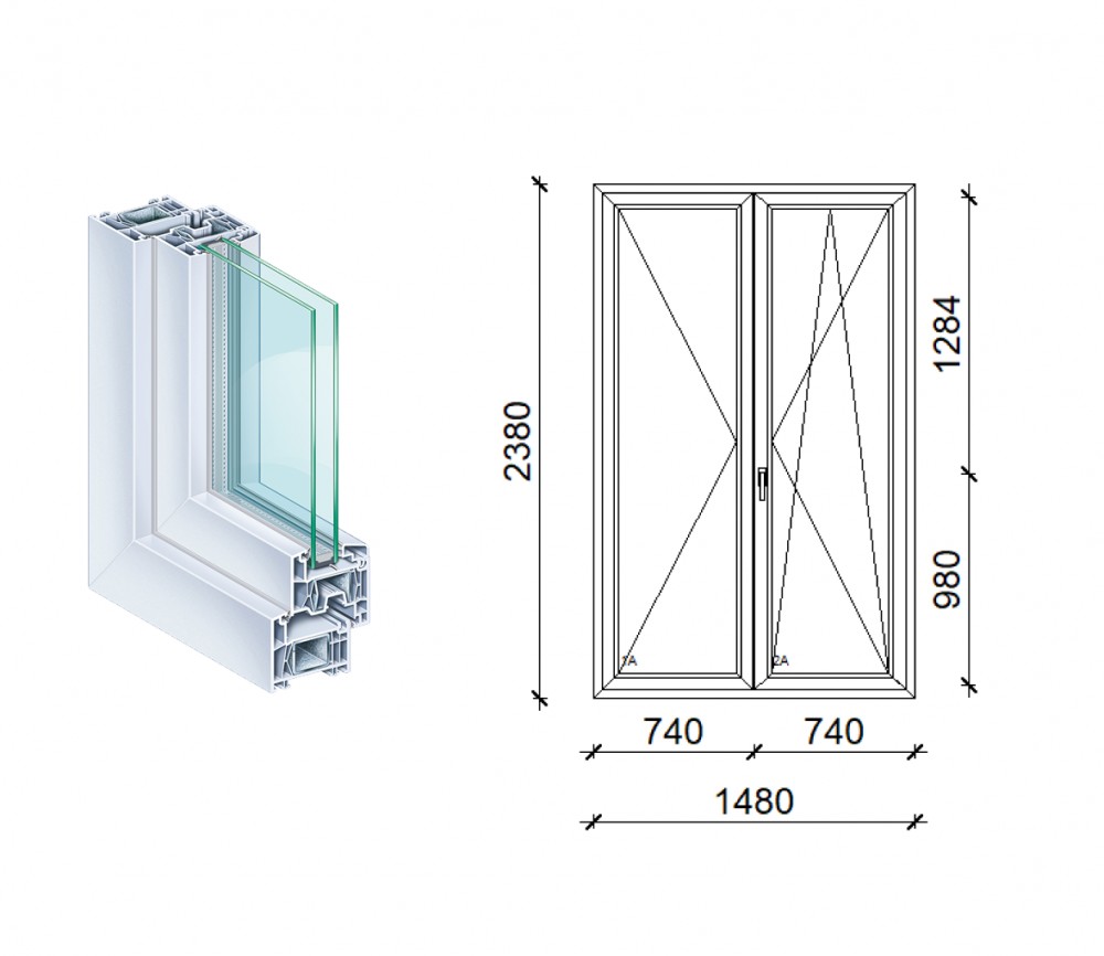 76 mm beépítési mélység, többkamrás műanyag profil.